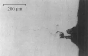 將點狀缺陷進行縱向解剖,進行顯微觀察,腐蝕孔的截面形態(tài)為腐蝕垂直于表面向縱深發(fā)展(圖2)。經(jīng)分析,坑底物質(zhì)主要是FeCl2•4H2O和Fe3O4,為腐蝕產(chǎn)物[1]。嚴重的小孔腐蝕還可能伴生氫脆或應力腐蝕,所以這是一種危害很大的缺陷。